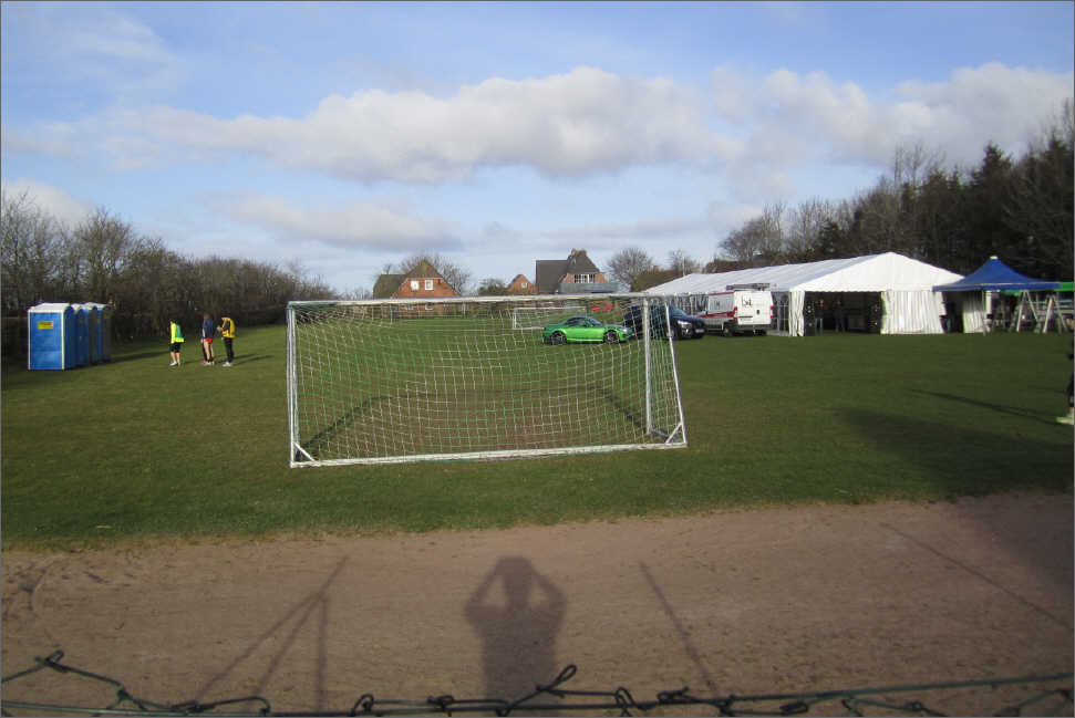 Vorbei am Sportplatz mit dem Festzelt und den „stillen Örtchen“.